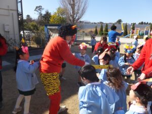 鬼は~そと!福は~うち!幼稚園にやって来た赤鬼青鬼をやっつけました! 豆をぶつけられて、おとなしくなった赤鬼青鬼さんと写真を撮ったよ!!