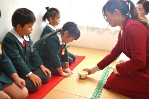 今日はお茶会を行いました。 年少さんは初めてのお茶会。初めてのお抹茶に初めての正座とちょっと戸惑っていました。 年長さんはお運びにもチャレンジしました。
