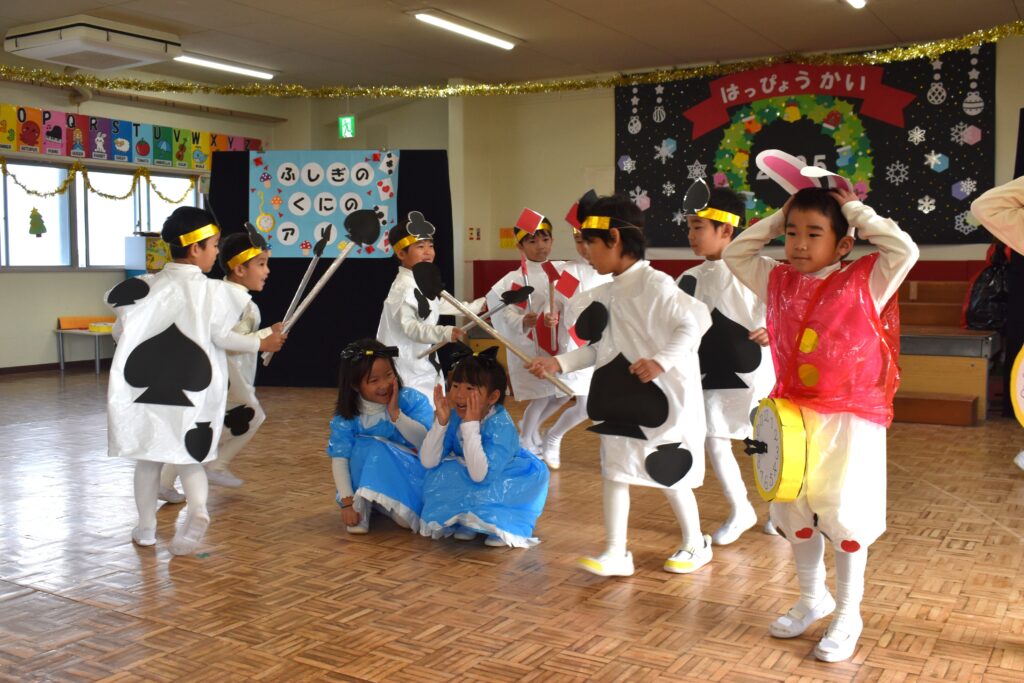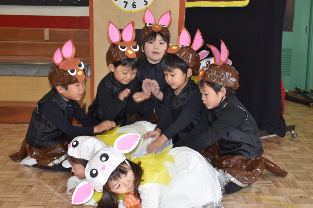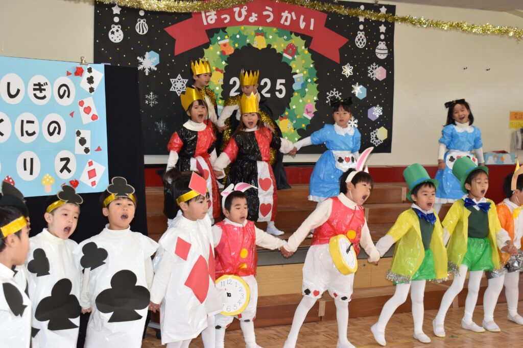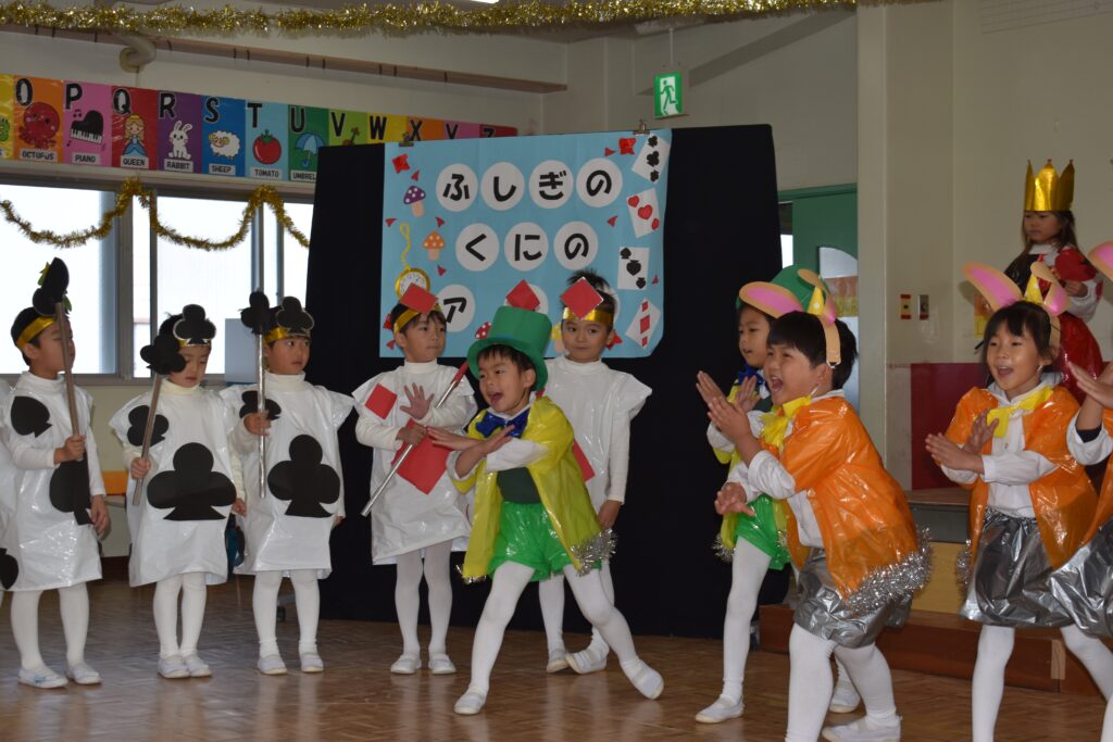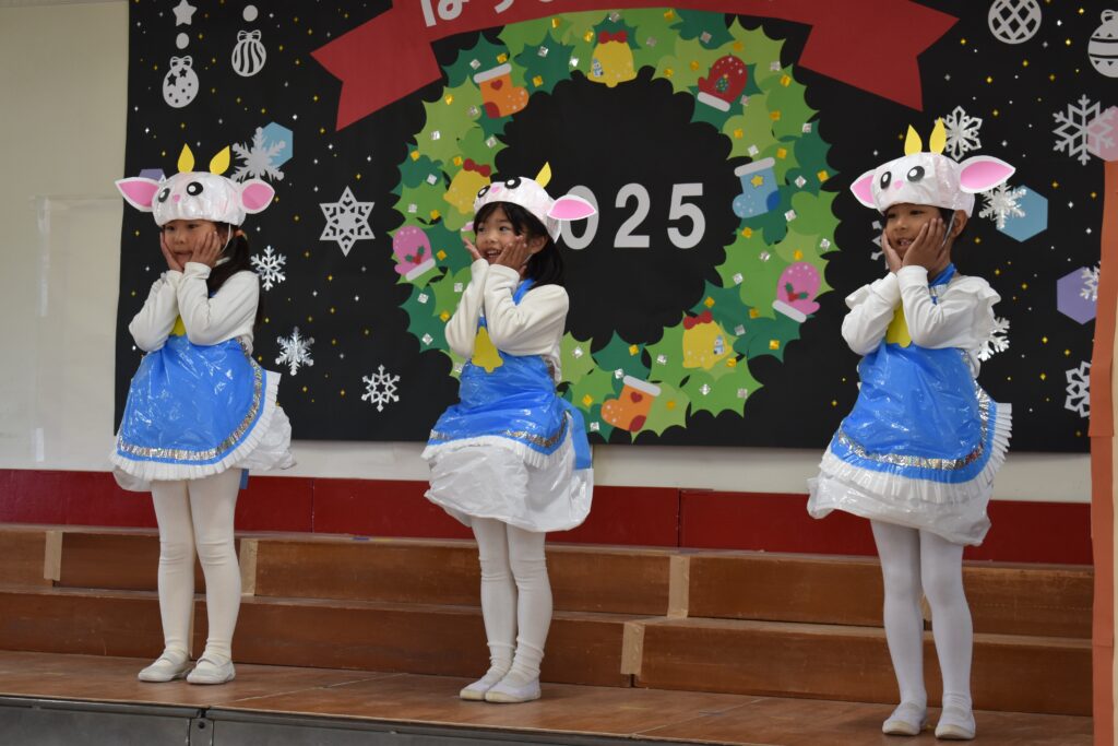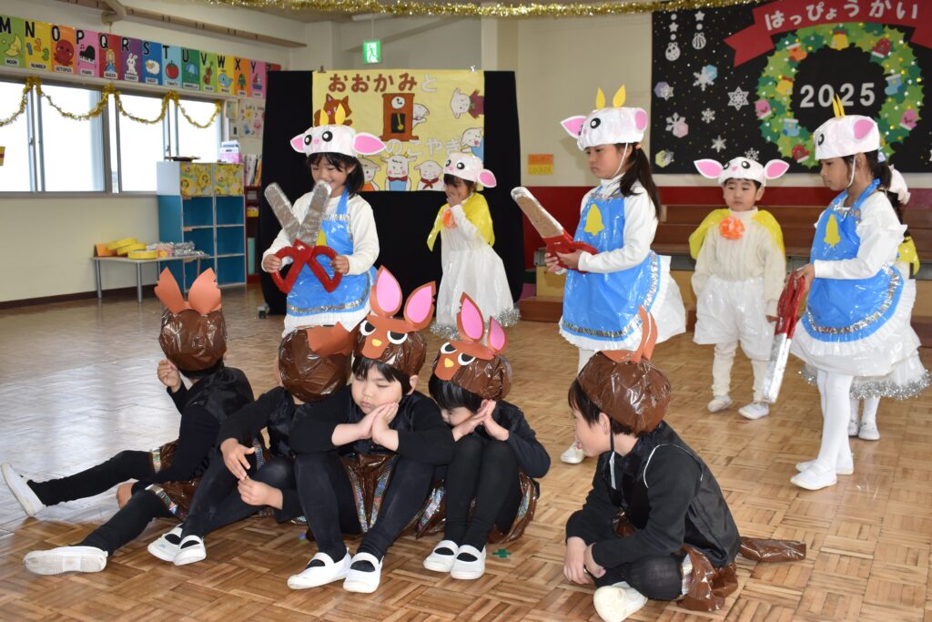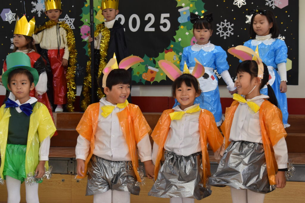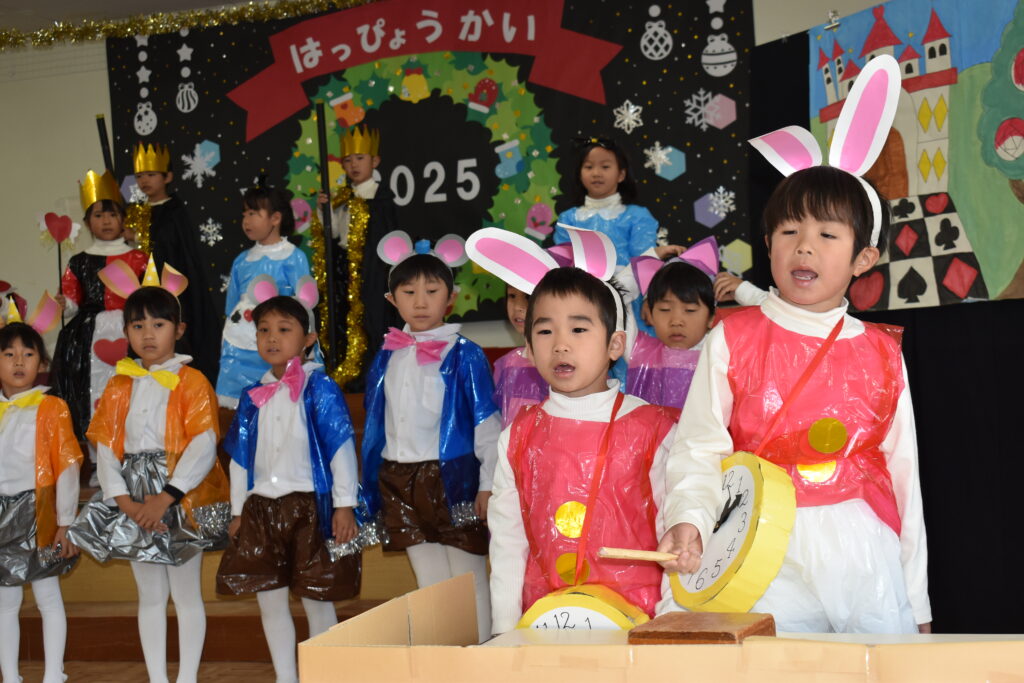 2025年12月12日 いべんと 発表会 今日は待ちに待った発表会! 一生懸命に練習した劇を保護者の方々に披露しました。 アップルクラス「おおかみと七ひきの子ヤギ」 ピーチクラス「てぶくろ」 キャロットクラス「不思議の国のアリス」