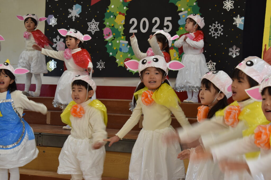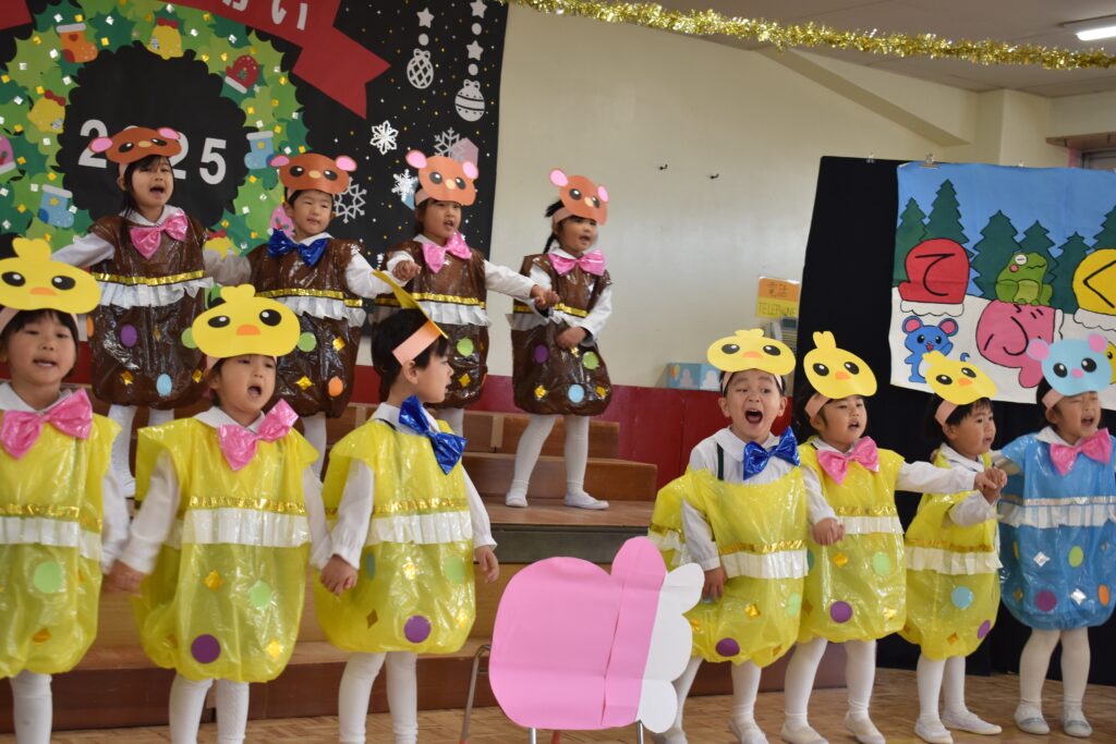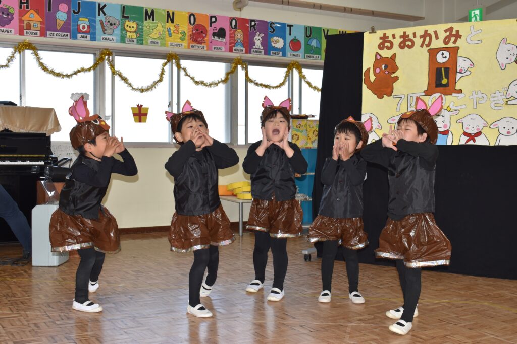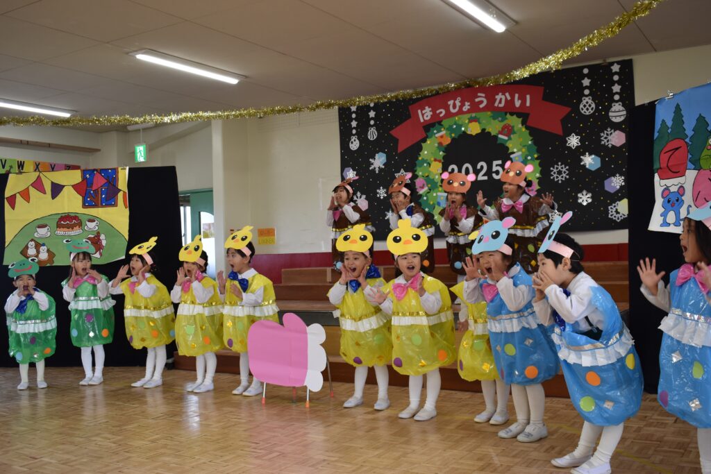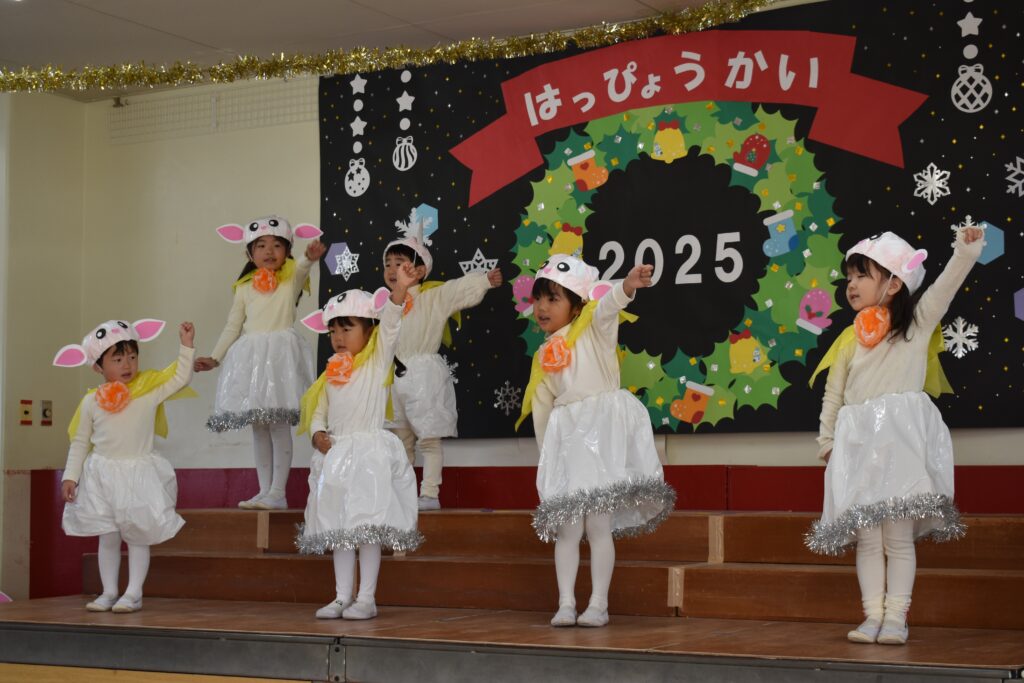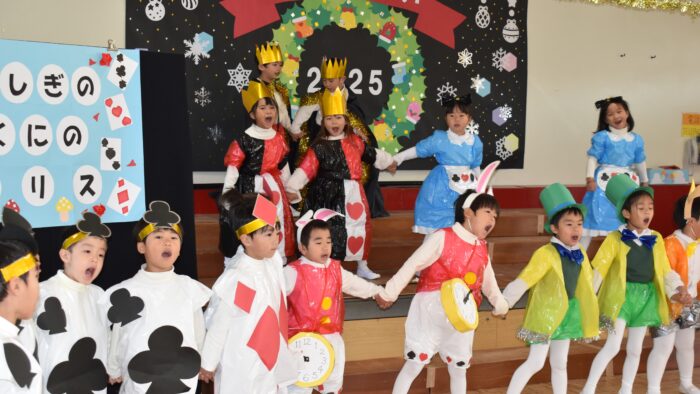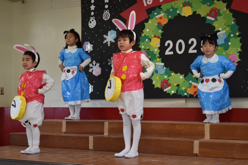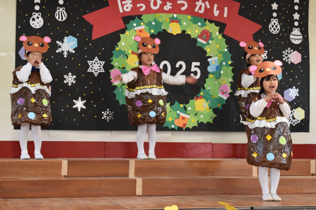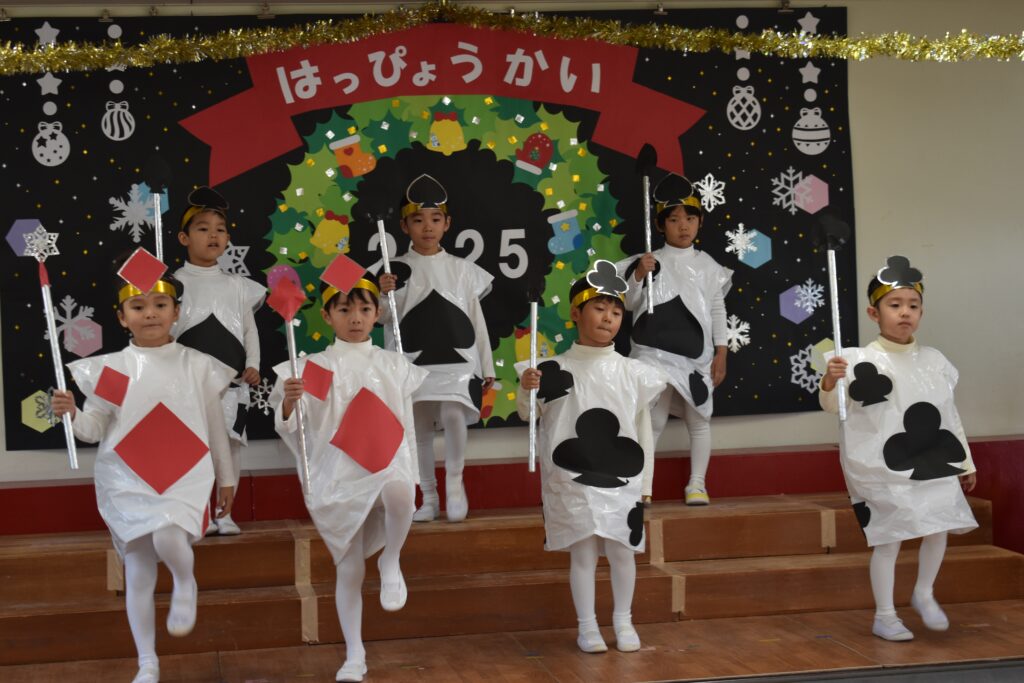 2025年12月12日 いべんと 発表会 今日は待ちに待った発表会! 一生懸命に練習した劇を保護者の方々に披露しました。 アップルクラス「おおかみと七ひきの子ヤギ」 ピーチクラス「てぶくろ」 キャロットクラス「不思議の国のアリス」